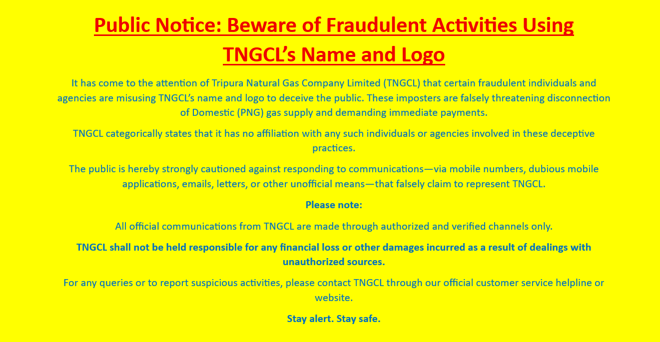 TRIPURA NATURAL GAS COMPANY LIMITED (TNGCL) is one of Eastern India's fastest growing Natural Gas Distribution Companies. Established on 10th July, 1990, TNGCL is a joint venture between GAIL (India) Ltd, Tripura Industrial Development Corporation Ltd. (A Govt. of Tripura Undertaking) and Assam Gas Company Ltd (A Govt. of Assam Undertaking)